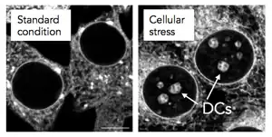 A nucleolar detention center (DC) is a region of the cell in which certain proteins are temporarily detained in periods of cellular stress.[1] DCs are absent from cells under normal culture conditions, but form in response to specific environmental triggers. The detention of numerous proteins in DCs is believed to reduce metabolic activity and promote survival under unfavorable conditions.[2] DCs form at the center of nucleoli and therefore disrupt the normal organization of these organelles. The structural remodeling that ensues leaves nucleoli unable to sustain their primary function, ribosomal biogenesis. Therefore, the formation of DCs is thought to convert nucleoli from “ribosome factories” to “prisons for proteins”.[1]