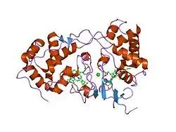 - ↑ Fulop V, Ridout CJ, Greenwood C, Hajdu J (November 1995). "Crystal structure of the di-haem cytochrome c peroxidase from Pseudomonas aeruginosa". Structure. 3 (11): 1225–33. doi:10.1016/s0969-2126(01)00258-1. PMID 8591033.