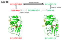 - 1 2 3 Fierke CA, Johnson KA, Benkovic SJ (June 1987). "Construction and evaluation of the kinetic scheme associated with dihydrofolate reductase from Escherichia coli". Biochemistry. 26 (13): 4085–92. doi:10.1021/bi00387a052. PMID 3307916.