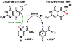 DHFR catalyzes the transfer of a hydride from NADPH to dihydrofolate with an accompanying protonation to produce tetrahydrofolate.[11] In the end, dihydrofolate is reduced to tetrahydrofolate and NADPH is oxidized to NADP+. The high flexibility of Met20 and other loops near the active site play a role in promoting the release of the product, tetrahydrofolate. In particular the Met20 loop helps stabilize the nicotinamide ring of the NADPH to promote the transfer of the hydride from NADPH to dihydrofolate.[17]