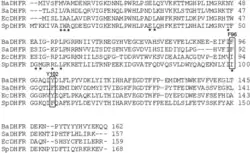 Dihydrofolate reductase from Bacillus anthracis (BaDHFR) is a validated drug target in the treatment of the infectious disease, anthrax. BaDHFR is less sensitive to trimethoprim analogs than is dihydrofolate reductase from other species such as Escherichia coli, Staphylococcus aureus, and Streptococcus pneumoniae. A structural alignment of dihydrofolate reductase from all four species shows that only BaDHFR has the combination phenylalanine and tyrosine in positions 96 and 102, respectively.