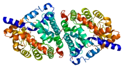 Dipeptidase 1 (DPEP1), or renal dipeptidase, is a membrane-bound glycoprotein responsible for hydrolyzing dipeptides. It is found in the microsomal fraction of the porcine kidney cortex.[5] It exists as a disulfide-linked homodimer that is glygosylphosphatidylinositol (GPI)-anchored to the renal brush border of the kidney.[6] The active site on each homodimer is made up of a barrel subunit with binuclear zinc ions that are bridged by the Gly125 side-chain located at the bottom of the barrel.[7]