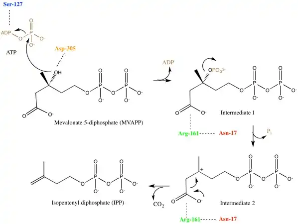 Mevalonate diphosphate decarboxylase recognizes and binds two substrates: ATP and mevalonate 5-diphosphate. After binding, the enzyme performs three types of reactions that can be separated into two main stages. First, phosphorylation occurs. This creates a reactive intermediate, which in the second stage undergoes concerted dephosphorylation and decarboxylation.[5] Many enzyme residues in the active site play important roles in this concerted mechanism. An aspartic acid residue deprotonates the C3 hydroxyl on MVAPP and facilitates the oxygen to attack a phosphate from ATP. As a result, intermediate 1, 3-phosphoMVAPP, now has a much better leaving group, which helps to produce intermediate 2.[1] This third intermediate is a transient beta carboxy carbonium intermediate and provides an "electron sink" that helps drives the decarboxylation reaction.[1]