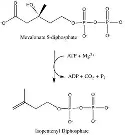 ![]() ATP dependent decarboxylation catalyzed by mevalonate diphosphate decarboxylase[1] | |||||||||