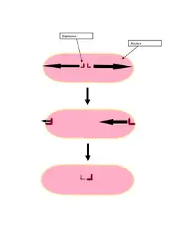 Diplosomes first appear during G2 phase of the cell cycle.[4] In the early stages of mitosis the diplosome will split and begin to move in opposite directions until both reach edges of the nucleus.[4] At this point one diplosome will return to the center of the nucleus while the other continues over the edge moving toward the center on the opposite side of the nucleus.[4] The separated diplosome will stay in place until the nuclear envelope has broken.[4]