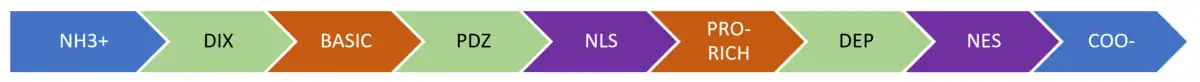 There are five main highly conserved regions that exist in all variations of DVL. These include an amino-terminal DIX (N-terminus) domain, a PDZ (central) domain, a carboxyl-terminal DEP (C-terminus) domain, and two regions with positively charged amino acid residues.[3] There is a proline-heavy region between the DIX and PDZ domains, and a largely basic region between the DIX and PDZ domains that has conserved serine and threonine residues. These regions mediate protein-protein interactions and help DVL channel signals into either the β-catenin or the β-catenin independent pathways.[3] Additionally, there is the conserved nuclear export sequence (NES) and a nuclear localization sequence (NLS), whose ability to move DVL between the cytoplasm and the nucleus may be an important part of its function.[3]