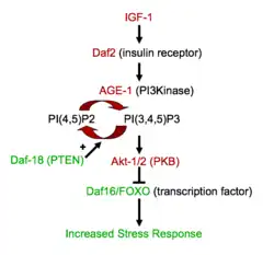 Much research has been done on the antagonistic effects of increased growth on lifespan. Specifically, the hormone insulin-like growth factor 1 (IGF-1), binds to a cell receptor, leading to a phosphorylation cascade. This cascade results in kinases phosphorylating forkhead transcription factor (FOXO), deactivating it. Deactivation of FOXO results in an inability to express genes involved in responding to oxidative stress response, such as antioxidants, chaperones, and heat-shock proteins.[6] Additionally, uptake of IGF-1 stimulates the mTOR pathway, which activates protein synthesis (and therefore growth) through upregulation of the translation-promoting S6K1, and also inhibits autophagy, a process necessary for recycling of damaged cellular products.[7] Decline of autophagy causes neurodegeneration, protein aggregation and premature aging.[8] Lastly, studies have also indicated that the mTOR pathway also alters immune responses and stimulates cyclin-dependent kinase (CDK) inhibitors such as p16 and p21. This leads to alteration of the stem-cell niche and results in stem cell exhaustion, another theorized mechanism of aging.[9]