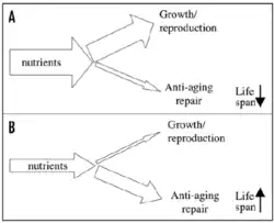 In biogerontology, the disposable soma theory of aging states that organisms age due to an evolutionary trade-off between growth, reproduction, and DNA repair maintenance.[1] Formulated by British biologist Thomas Kirkwood, the disposable soma theory explains that an organism only has a limited amount of resources that it can allocate to its various cellular processes.[2] Therefore, a greater investment in growth and reproduction would result in reduced investment in DNA repair maintenance, leading to increased cellular damage, shortened telomeres, accumulation of mutations, compromised stem cells, and ultimately, senescence. Although many models, both animal and human, have appeared to support this theory, parts of it are still controversial. Specifically, while the evolutionary trade-off between growth and aging has been well established, the relationship between reproduction and aging is still without scientific consensus, and the cellular mechanisms largely undiscovered.[3]