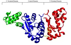 The E. Coli DnaG primase is a 581 residue monomeric protein with three functional domains, according to proteolysis studies. There is an N-terminal Zinc-binding domain (residues 1–110) where a zinc ion is tetrahedrally coordinated between one histidine and three cysteine residues, which plays a role in recognizing sequence specific DNA binding sites. The central domain (residues 111–433) displays RNA polymerase activities, and is the site of RNA primer synthesis. The C-terminal domain (residues 434–581) is responsible for the noncovalent binding of DnaG to the DnaB helicase protein.[8]