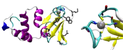 The zinc-binding site of B. stearothermophilus consists of three cysteine residues, Cys40, Cys61, and Cys64, and one histidine residue, His43. Cys40 and His43 are located on the β-hairpin between the second and third β sheet.[9] Cys61 is located on the fifth β sheet, and Cys64 is on the β-hairpin between the fourth and fifth β sheet. These four residues coordinate the zinc ion tetrahedrally. The zinc ion is thought to stabilize the loops between the second and third β sheet as well as the fourth and fifth β sheet. The domain is further stabilized by a number of hydrophobic interactions between the hydrophobic inner surface of the β sheet which is packed against the second and third α helices. The outer surface of the β sheet also has many conserved hydrophobic and basic residues. These residues are Lys30, Arg34, Lys46, Pro48, Lys56, Ile58, His60 and Phe62.[9]