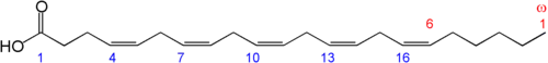 n-6 DPA is an ω-6 fatty acid with the trivial name osbond acid. It is formed in two steps from eicosatetraenoic acid (5,8,11,14-20:4n-6 or arachidonic acid, AA). Arachidonic acid is elongated to docosatetraenoic acid (7,10,13,16-22:4n-6 or adrenic acid, AdA), which in turn is converted by Δ4-desaturase to osbond acid.[3]