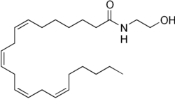 - ↑ Hanus, L.; Gopher, A.; Almog, S.; et al. (1993). "Two new unsaturated fatty acid ethanolamides in brain that bind to the cannabinoid receptor". J Med Chem. 36 (20): 3032–3034. doi:10.1021/jm00072a026. PMID 8411021.