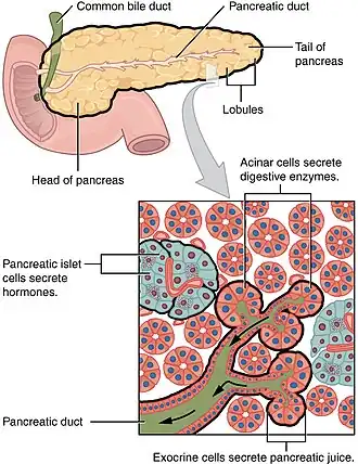 - ↑ "English: The pancreas has many functions, served by the endocrine cells in the islets of Langerhans and the exocrine acinar cells. Pancreatic cancer may arise from any of these and disrupt any of their functions". OpenStax College. Retrieved 2022-12-07.