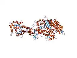 Dynamin is a GTPase protein responsible for endocytosis in the eukaryotic cell. Dynamin is part of the "dynamin superfamily", which includes classical dynamins, dynamin-like proteins, Mx proteins, OPA1, mitofusins, and GBPs. Members of the dynamin family are principally involved in the scission of newly formed vesicles from the membrane of one cellular compartment and their targeting to, and fusion with, another compartment, both at the cell surface (particularly caveolae internalization) as well as at the Golgi apparatus.[1][2][3] Dynamin family members also play a role in many processes including division of organelles,[4] cytokinesis and microbial pathogen resistance.