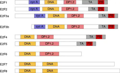 E2F family members play a major role during the G1/S transition in mammalian and plant cell cycle (see KEGG cell cycle pathway). DNA microarray analysis reveals unique sets of target promoters among E2F family members suggesting that each protein has a unique role in the cell cycle.[2] Among E2F transcriptional targets are cyclins, CDKs, checkpoints regulators, DNA repair and replication proteins. Nonetheless, there is a great deal of redundancy among the family members. Mouse embryos lacking E2F1, E2F2, and one of the E2F3 isoforms, can develop normally when either E2F3a or E2F3b, is expressed.[3]