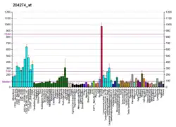 This gene was identified as an estrogen-responsive gene. Regulation of transcription by estrogen is mediated by estrogen receptor which binds to the estrogen-responsive element (ERE) found in the 5'-flanking region of this gene. The encoded protein is a tumor-associated antigen that is expressed at high frequency in a variety of cancers. Two transcript variants differing in the 5' UTR, but encoding the same protein, have been identified for this gene.[5]