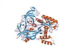 - ↑ Pérez JM, Siegal G, Kriek J, Hård K, Dijk J, Canters GW, Möller W (February 1999). "The solution structure of the guanine nucleotide exchange domain of human elongation factor 1beta reveals a striking resemblance to that of EF-Ts from Escherichia coli". Structure. 7 (2): 217–26. doi:10.1016/S0969-2126(99)80027-6. PMID 10368288.