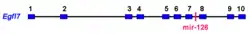 Epidermal Growth Factor like domain 7 (Egfl7) also known as Vascular Endothelial-statin (VE-statin) codes for a gene mostly expressed in endothelial cells.[6][7][8] The egfl7 gene is located on chromosomes 9 and 2 in human and mouse, respectively, and is structured in 11 exons and introns, including intron-1a and 1b which are alternatively transcribed from two different promoters.[6] These transcripts vary only in the first exon and code for the same protein which is initiated in the third exon [6] The seventh intron of the egfl7 gene contains a miRNA site for miR-126 and miR-126.[9]