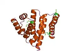 In molecular biology, the eIF-W2 domain functions as the binding site for Mnk eIF4E kinase,[2] an enzyme that phosphorylates eukaryotic initiation factor 4E (eIF4E). For eIF2B-epsilon, the W2 C-terminal domain functions in guanine nucleotide exchange on eIF2. For eIF5, the W2 domain functions in mediating the multifactor complex (MFC) formation with eIF1, eIF2-GTP, eIF3 and Met-tRNAiMet. The eIF5 W2 C-terminal domain and the adjacent N-terminal linker region are responsible for the GDI activity against eIF2-GDP.[3]