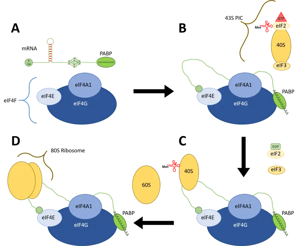 eIF4A1 is a component of the eIF4F translation initiation complex, along with eIF4E, the 5'-terminal cap binding protein, and eIF4G, the scaffold protein that holds eIF4A and eIF4E together.[10] The eIF4F complex is often accompanied by the accessory proteins eIF4B and eIF4H, either of which can differentially enhance the activity of eIF4A1. After mRNA is transcribed from DNA and translocated to the cytoplasm, and the cytosolic PABP is bound to the Poly(A)-tail of the nascent mRNA, its 5'-cap will bind to eIF4E and PABP will bind to eIF4G.[8] eIF4A1 will then unwind the RNA secondary structure from 5' to 3' as the 43S PIC is recruited to the eIF4F complex.[8] The 43S PIC will scan the unwound mRNA from 5' to 3' as well, until it reaches the AUG start codon, whereupon the 60S ribosomal subunit will be recruited to begin the process of elongation.[8]