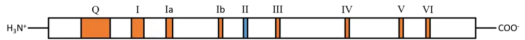 eIF4A1 is a member of the DEAD box family of RNA helicases.[11] RNA helicases are enzymes that use the energy released from the hydrolysis of ATP to manipulate the secondary structure of RNA, and the DEAD box family is the largest family of RNA helicases.[11] The name "DEAD box" refers the key D-E-A-D amino acid sequence on motif II of the helicase that participates in nucleoside triphosphate binding (in the instance of eIF4A1, ATP). Other conserved motifs, shared by all eIF4A family proteins, are the Q, I, Ia, Ib, III, IV, V and VI motifs. Motifs Ia, Ib, IV and V bind RNA, motifs I, II, and III mediate RNA-dependent ATPase activity, and motif VI, is required for both RNA binding and ATP hydrolysis.[10]