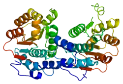 Eukaryotic initiation factor 4A-I (also known as eIF4A1 or DDX2A) is a 46 kDa cytosolic protein that, in humans, is encoded by the EIF4A1 gene, which is located on chromosome 17.[5][6][7] It is the most prevalent member of the eIF4A family of ATP-dependant RNA helicases, and plays a critical role in the initiation of cap-dependent eukaryotic protein translation as a component of the eIF4F translation initiation complex.[8] eIF4A1 unwinds the secondary structure of RNA within the 5'-UTR of mRNA, a critical step necessary for the recruitment of the 43S preinitiation complex, and thus the translation of protein in eukaryotes.[8] It was first characterized in 1982 by Grifo, et al., who purified it from rabbit reticulocyte lysate.[9]