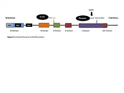 As depicted in Figure 1, the Elk1 protein is composed of several domains. Localized in the N-terminal region, the A domain is required for the binding of Elk1 to DNA. This region also contains a nuclear localization signal (NLS) and a nuclear export signal (NES), which are responsible for nuclear import and export, respectively. The B domain allows Elk1 to bind to a dimer of its cofactor, serum response factor (SRF). Located adjacent to the B domain, the R domain is involved in suppressing Elk1 transcriptional activity. This domain harbors the lysine residues that are likely to undergo SUMOylation, a post-translational event that strengthens the inhibition function of the R domain. The D domain plays the key role of binding to active Mitogen-activated protein kinases (MAPKs). Located in the C-terminal region of Elk1, the C domain includes the amino acids that actually become phosphorylated by MAPKs. In this region, Serine 383 and 389 are key sites that need to be phosphorylated for Elk1-mediated transcription to occur. Finally, the DEF domain is specific for the interaction of activated extracellular signal-regulated kinase (Erk), a type of MAPK, with Elk1.[6]