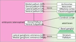 During embryonic development, the telencephalon is the birthplace of a diverse collection of neuronal and glial cells. These cells undergo varying patterns of cell migration in order to reach their final positions in what will become the mature cerebral cortex and basal ganglia. The embryonic telencephalon is subdivided into dorsal pallium and ventral subpallium. These two pallia become the mammalian cerebral cortex and basal ganglia, respectively.