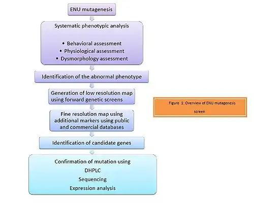 Ever since the discovery of ENU as the most potent mutagen by Russell et al. it has been used in forward (phenotype based) genetic screens with which one can identify and study a phenotype of interest. As illustrated in Figure 1, the screening process begins with mutagenising a male mouse with ENU. This is followed by systematic phenotypic analysis of the progeny. The progeny are assessed for behavioral, physiological or dysmorphological changes. The abnormal phenotype is identified. Identification of the candidate gene is then achieved by positional cloning of the mutant mice with the phenotype of interest.