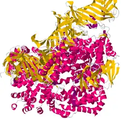 - 1 2 3 Kochan G, Krojer T, Harvey D, Fischer R, Chen L, Vollmar M, et al. (May 2011). "Crystal structures of the endoplasmic reticulum aminopeptidase-1 (ERAP1) reveal the molecular basis for N-terminal peptide trimming". Proceedings of the National Academy of Sciences of the United States of America. 108 (19): 7745–7750. Bibcode:2011PNAS..108.7745K. doi:10.1073/pnas.1101262108. PMC 3093473. PMID 21508329.