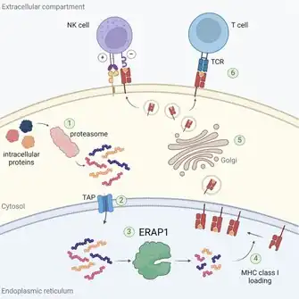 ERAP1 "trimming" modulates the peptide repertoire presented by MHC class I molecules and thereby shapes the adaptive immune response.[6][8][9] In murine models, ERAAP (the murine homologue of human ERAP1) deficiency results in a strong alteration and increased immunogenicity of the peptide repertoire presented by MHC-I.[10] Murine models with genetic deficiency for ERAAP have been instrumental for understanding the role of peptide trimming in the ER.[8][11][12]