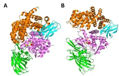 - ↑ Maben Z, Arya R, Georgiadis D, Stratikos E, Stern LJ (September 2021). "Conformational dynamics linked to domain closure and substrate binding explain the ERAP1 allosteric regulation mechanism". Nature Communications. 12 (1): 5302. Bibcode:2021NatCo..12.5302M. doi:10.1038/s41467-021-25564-w. PMC 8421391. PMID 34489420.