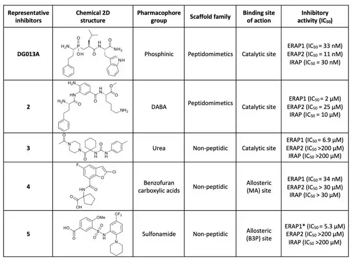 A novel family of zinc-targeting diaminobenzoic acid (DABA) compounds were rationally designed and developed in 2013, displaying micromolar potency for ERAP1 inhibition (compound 2, IC50 = 2 μM, Table 1). Moderate selectivity over ERAP2 and IRAP with additional optimization efforts based on extensive investigation of SAR has been achieved.[43][44]