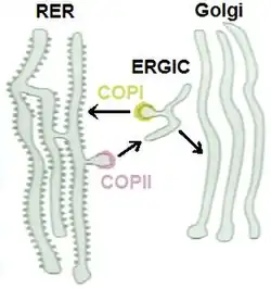 - ↑ Appenzeller-Herzog C, Hauri HP (June 2006). "The ER-Golgi intermediate compartment (ERGIC): in search of its identity and function". J. Cell Sci. 119 (Pt 11): 2173–83. doi:10.1242/jcs.03019. PMID 16723730.