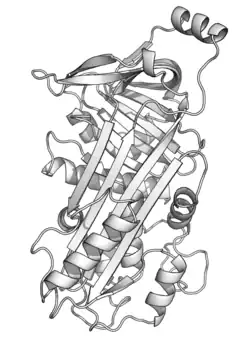 Ovalbumin (abbreviated OVA[1]) is the main protein found in egg white, making up approximately 55% of the total protein.[2] Ovalbumin displays sequence and three-dimensional homology to the serpin superfamily, but unlike most serpins it is not a serine protease inhibitor.[3] The function of ovalbumin is unknown, although it is presumed to be a storage protein.[4]
