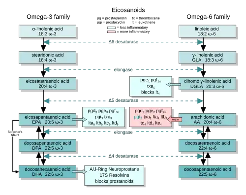 There are multiple subfamilies of eicosanoids, including most prominently the prostaglandins, thromboxanes, leukotrienes, lipoxins, resolvins, and eoxins.[1] For each subfamily, there is the potential to have at least 4 separate series of metabolites, two series derived from the ω−6 PUFAs arachidonic and dihomo-gamma-linolenic acids, one series derived from the ω−3 PUFA eicosapentaenoic acid, and one series derived from the ω−9 PUFA mead acid. This subfamily distinction is important. Mammals, including humans, are unable to convert ω−6 into ω−3 PUFA. In consequence, tissue levels of the ω−6 and ω−3 PUFAs and their corresponding eicosanoid metabolites link directly to the amount of dietary ω−6 versus ω−3 PUFAs consumed.[3] Since certain of the ω−6 and ω−3 PUFA series of metabolites have almost diametrically opposing physiological and pathological activities, it has often been suggested that the deleterious consequences associated with the consumption of ω−6 PUFA-rich diets reflects excessive production and activities of ω−6 PUFA-derived eicosanoids, while the beneficial effects associated with the consumption of ω−3 PUFA-rich diets reflect the excessive production and activities of ω−3 PUFA-derived eicosanoids.[4][5][6][7] In this view, the opposing effects of ω−6 PUFA-derived and ω−3 PUFA-derived eicosanoids on key target cells underlie the detrimental and beneficial effects of ω−6 and ω−3 PUFA-rich diets on inflammation and allergy reactions, atherosclerosis, hypertension, cancer growth, and a host of other processes.