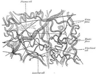 Elastic fibers (or yellow fibers) are an essential component of the extracellular matrix composed of bundles of proteins (elastin) which are produced by a number of different cell types including fibroblasts, endothelial, smooth muscle, and airway epithelial cells.[1] These fibers are able to stretch many times their length, and snap back to their original length when relaxed without loss of energy. Elastic fibers include elastin, elaunin and oxytalan.