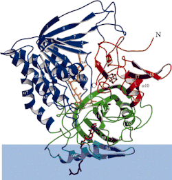 ![]() Ribbon diagram of electron-transferring-flavoprotein dehydrogenase with each functional domain differentially colored. Blue band is membrane area. | |||||||