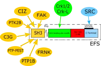 - Central "substrate domain" containing multiple repeats of tyrosine residues embedded within specific conserved sequences (YxxP) (amino acids 69-350 for human EFS).[21] This region contains 9 such binding sites, in contrast to family members BCAR1 and NEDD9 (20 and 18 motifs, respectively) and similar to CASS4 (estimated at 10 such motifs).[13] Once phosphorylated by SRC or other kinases, these tyrosine motifs are bound by the SH2 domains of signaling proteins. Important binding partners for this region include Crk1/2 and Crk-L, a Crk1 paralogue.[7][13][22][23]