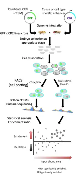 Despite being a powerful model organism for biology and the study of transcriptional enhancers, the tissue specific activity of less than 5% of the estimated 50,000 transcriptional enhancers in Drosophila melanogaster have been discovered.[7][8] Over the past decade, the main method for detection of tissue- or cell-type specific activities of enhancers in Drosophila melanogaster was to test candidate enhancers by traditional reporter assays,[9][10] which are low-throughput and costly. Over the past few years, even though enhancer discovery has been improved and other parallel reporter assays have been developed,[11][12][13][14][15][16] none so far allowed the direct identification of enhancer activity in a genomic context in cell types of interest in a whole embryo.