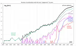 The term epigenesis has a generic meaning of "extra growth" that has been used in English since the 17th century.[9] In scientific publications, the term epigenetics started to appear in the 1930s (see Fig. on the right). However, its contemporary meaning emerged only in the 1990s.[10]