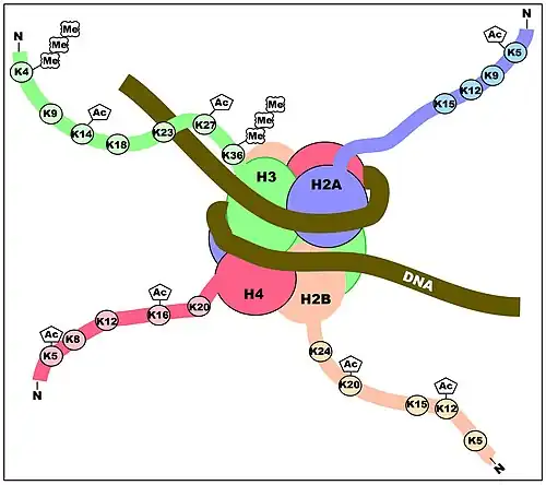 Although histone modifications occur throughout the entire sequence, the unstructured N-termini of histones (called histone tails) are particularly highly modified. These modifications include acetylation, methylation, ubiquitylation, phosphorylation, sumoylation, ribosylation and citrullination. Acetylation is the most highly studied of these modifications. For example, acetylation of the K14 and K9 lysines of the tail of histone H3 by histone acetyltransferase enzymes (HATs) is generally related to transcriptional competence[34] (see Figure).