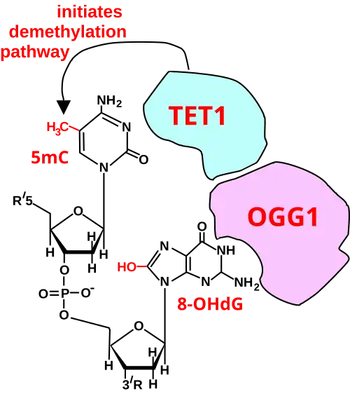 When OGG1 is present at an oxidized guanine within a methylated CpG site it recruits TET1 to the 8-OHdG lesion (see Figure). This allows TET1 to demethylate an adjacent methylated cytosine. Demethylation of cytosine is an epigenetic alteration.