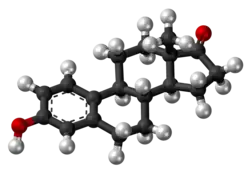 Estrone (E1), also spelled oestrone, is a steroid, a weak estrogen, and a minor female sex hormone.[1] It is one of three major endogenous estrogens, the others being estradiol and estriol.[1] Estrone, as well as the other estrogens, are synthesized from cholesterol and secreted mainly from the gonads, though they can also be formed from adrenal androgens in adipose tissue.[2] Relative to estradiol, both estrone and estriol have far weaker activity as estrogens.[1] Estrone can be converted into estradiol, and serves mainly as a precursor or metabolic intermediate of estradiol.[1][3] It is both a precursor and metabolite of estradiol.[4][1]