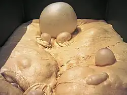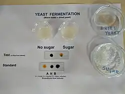 Ethanol fermentation causes bread dough to rise. Yeast organisms consume sugars in the dough and produce ethanol and carbon dioxide as waste products. The carbon dioxide forms bubbles in the dough, expanding it to a foam. Less than 2% ethanol remains after baking.[5][6]