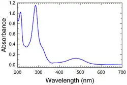 As with most fluorescent compounds, ethidium bromide is aromatic. Its core heterocyclic moiety is generically known as a phenanthridine, an isomer of which is the fluorescent dye acridine. Absorption maxima of EtBr in aqueous solution are at 210 nm and 285 nm, which correspond to ultraviolet light. As a result of this excitation, EtBr emits orange light with wavelength 605 nm.[8][9]