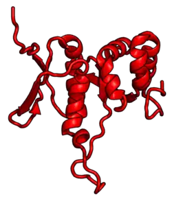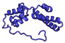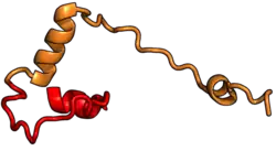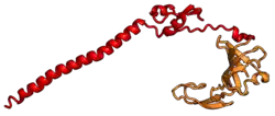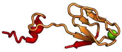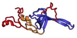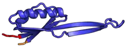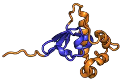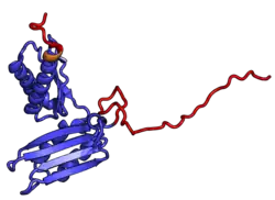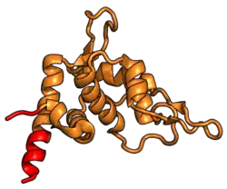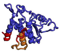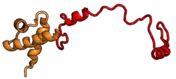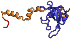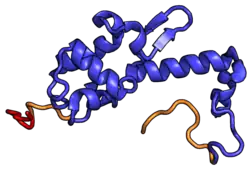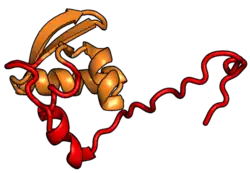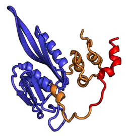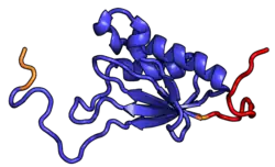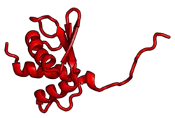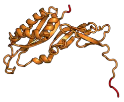 The table "40S ribosomal proteins" shows the individual protein folds of the 40S subunit colored by conservation. Proteins which have homologs in eukaryotes, archaea and bacteria (EAB) are shown as blue ribbons. Proteins shared only between eukaryotes and archaea (EA) are shown as orange ribbons and proteins specific to eukaryotes (E) are shown as red ribbons. Eukaryote-specific extensions of conserved proteins, ranging from a few residues or loops to very long alpha helices and additional domains, are highlighted in red.[2] For a details, refer to the article on the eukaryotic ribosome. Historically, different nomenclatures have been used for ribosomal proteins. For instance, proteins have been numbered according to their migration properties in gel electrophoresis experiments. Therefore, different names may refer to homologous proteins from different organism, while identical names not necessarily denote homologous proteins. The table "40S ribosomal proteins" crossreferences the human ribosomal protein names with yeast, bacterial and archaeal homologs.[8] Further information can be found in the ribosomal protein gene database (RPG).[8]