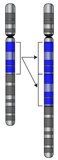 Mutations can involve large sections of a chromosome becoming duplicated (usually by genetic recombination), which can introduce extra copies of a gene into a genome.[32] Extra copies of genes are a major source of the raw material needed for new genes to evolve.[33] This is important because most new genes evolve within gene families from pre-existing genes that share common ancestors.[34] For example, the human eye uses four genes to make structures that sense light: three for colour vision and one for night vision; all four are descended from a single ancestral gene.[35]
