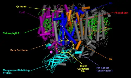 Evidence suggests that manganese (Mn) was first incorporated into biological systems roughly 3.2–2.8 billion years ago, during the Archean Period. Together with calcium, it formed the manganese-calcium oxide complex (determined by X-ray diffraction) which consisted of a manganese cluster, essentially an inorganic cubane (cubical) structure. The incorporation of a manganese center in photosystem II was highly significant, as it allowed for photosynthetic oxygen evolution of plants. The oxygen-evolving complex (OEC) is a critical component of photosystem II contained in the thylakoid membranes of chloroplasts; it is responsible for terminal photooxidation of water during light reactions.[11]