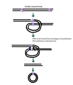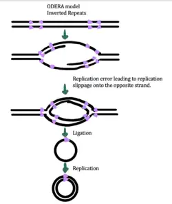 While the exact mechanism for eccDNA generation is still unknown, some studies have suggested that eccDNA generation might be linked to DNA damage repair,[33] hyper-transcription,[33][34] homologous recombination,[35] and replication stress.[33] There are multiple proposed mechanisms for eccDNA formation: (1) replication slippage creates a loop on the template strand that is then excised and ligated into a circle leaving a microdeletion on the chromosome, (2) replication slippage creates a loop in the product strand that is excised and ligated into a circle that does not generate a microdeletion in the chromosome, (3) the ODERA mechanism of eccDNA formation, and (4) a double stranded break in a repeat region is repaired by homologous recombination, during which the fragment forms a circle and the chromosome suffers a microdeletion[1]